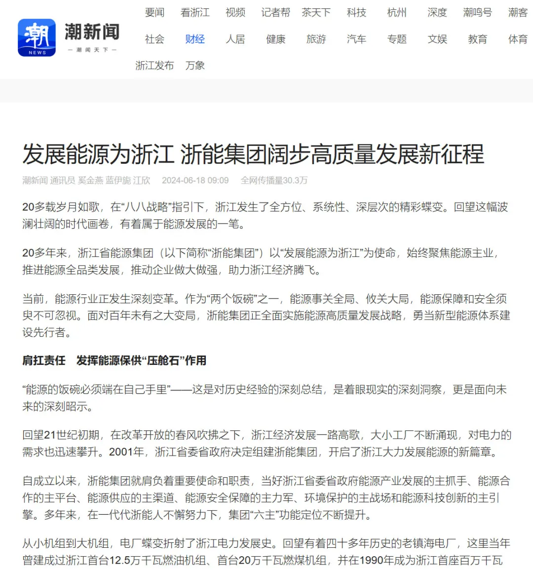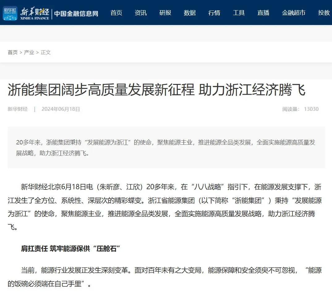 6月18日,東方財富網(wǎng)報道《發(fā)展能源為浙江 浙能集團(tuán)闊步高質(zhì)量發(fā)展新征程》。