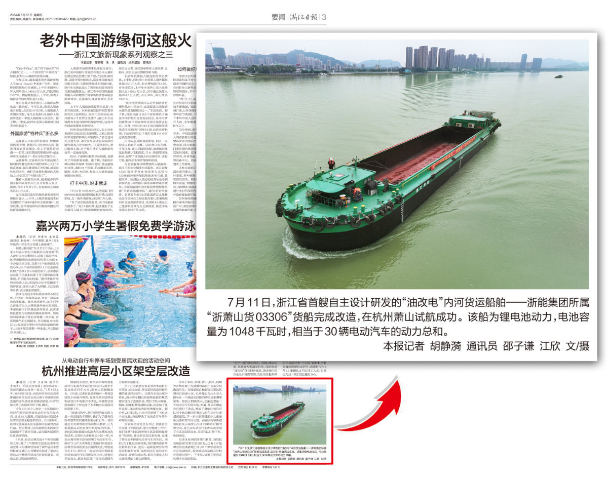 7月12日,《浙江日?qǐng)?bào)》報(bào)道:浙江省首艘自主設(shè)計(jì)研發(fā)的“油改電”內(nèi)河貨運(yùn)船舶——浙能集團(tuán)所屬“浙蕭山貨03306”貨船完成改造,在杭州蕭山試航成功。 浙江日?qǐng)?bào) 圖