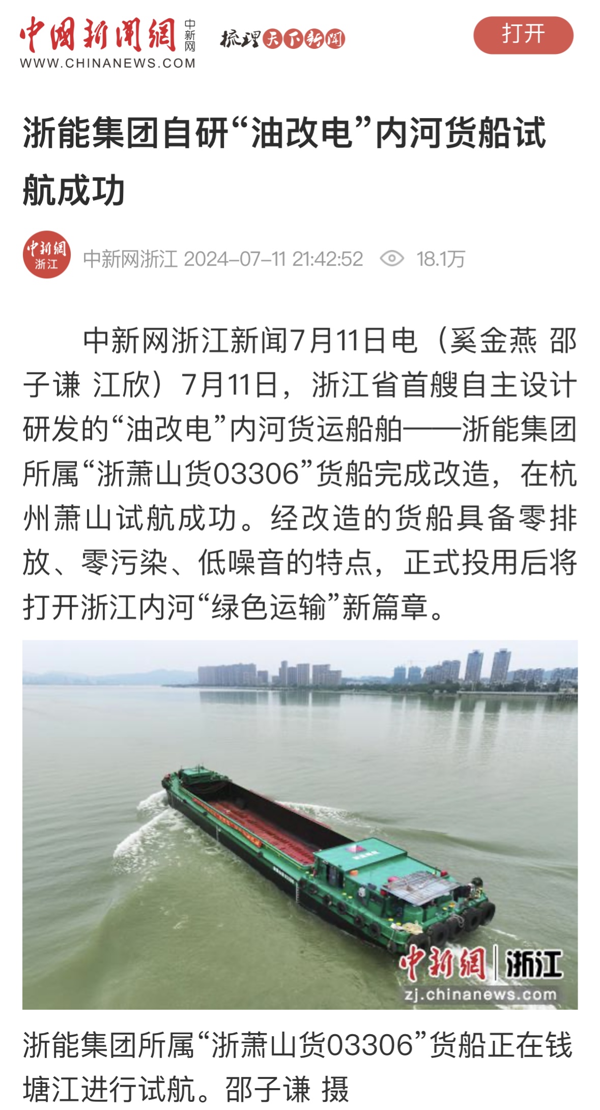 7月11日,中國(guó)新聞網(wǎng)報(bào)道《浙能集團(tuán)自研“油改電”內(nèi)河貨船試航成功》。 中國(guó)新聞網(wǎng) 圖