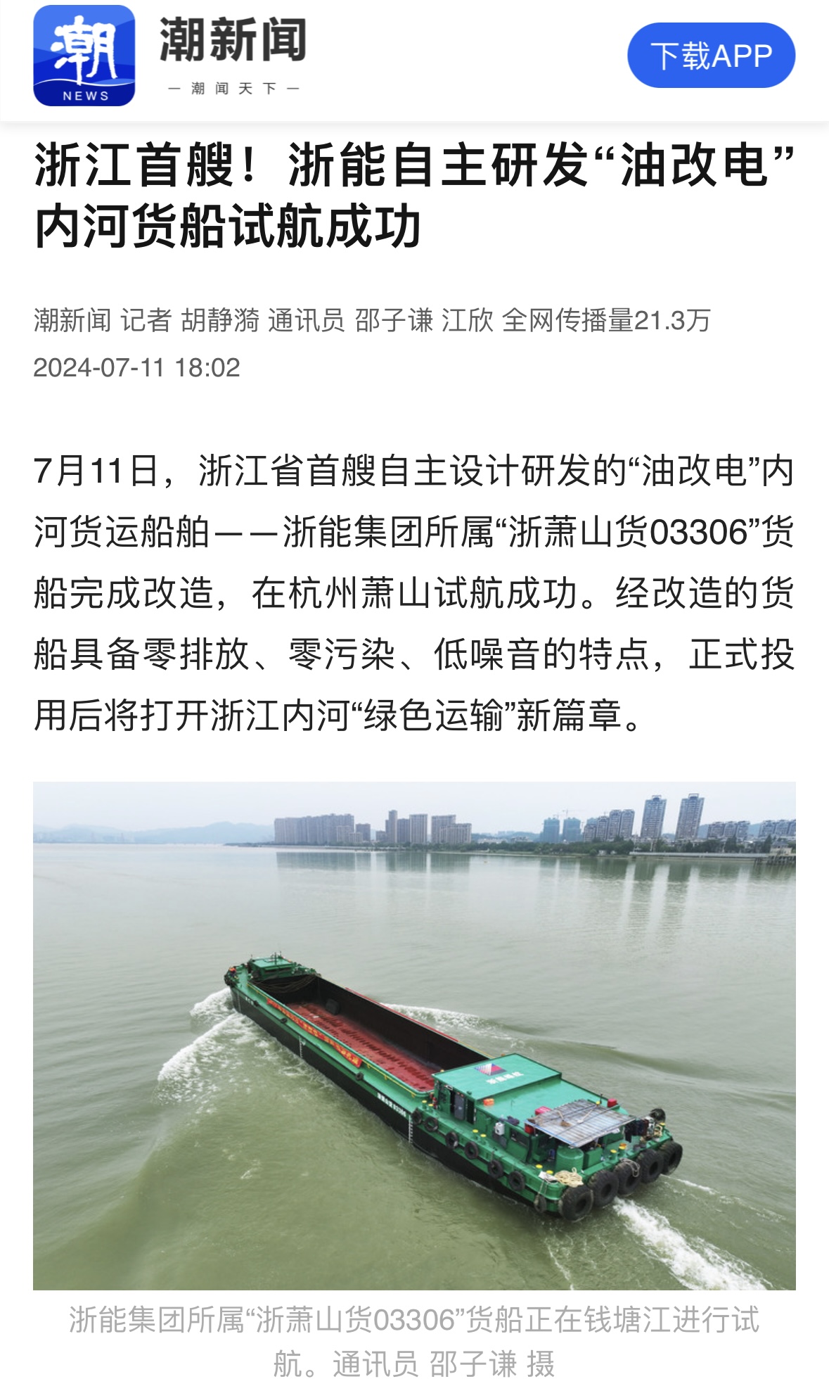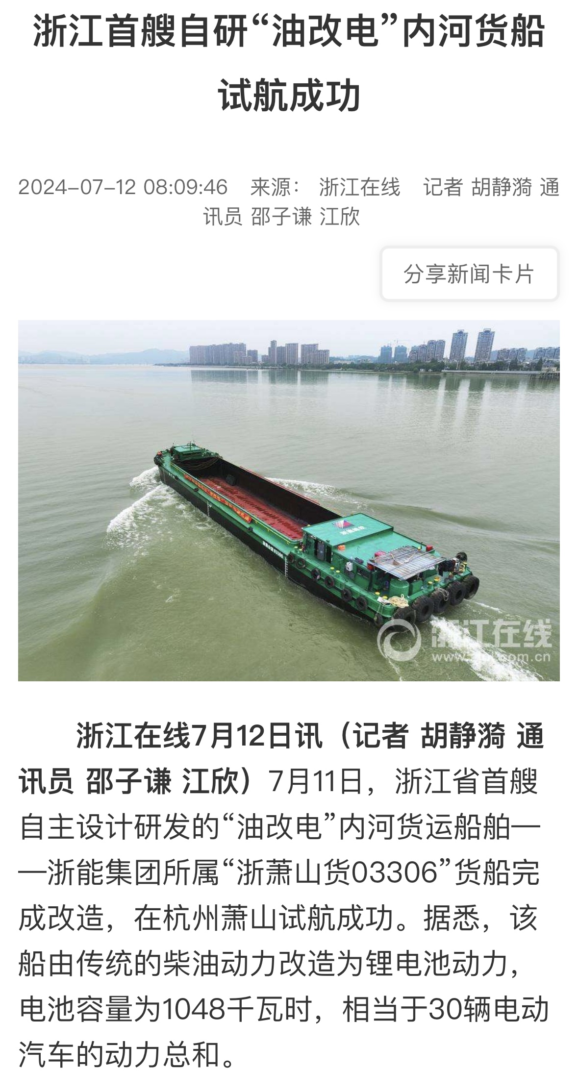 7月12日,浙江在線公眾號(hào)報(bào)道《浙能集團(tuán)自研“油改電”內(nèi)河貨船試航成功》。 浙江在線 圖