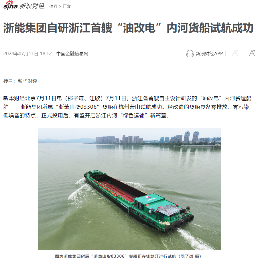 7月11日,新華財(cái)經(jīng)報(bào)道《浙能集團(tuán)自研“油改電”內(nèi)河貨船試航成功》。 新華財(cái)經(jīng) 圖