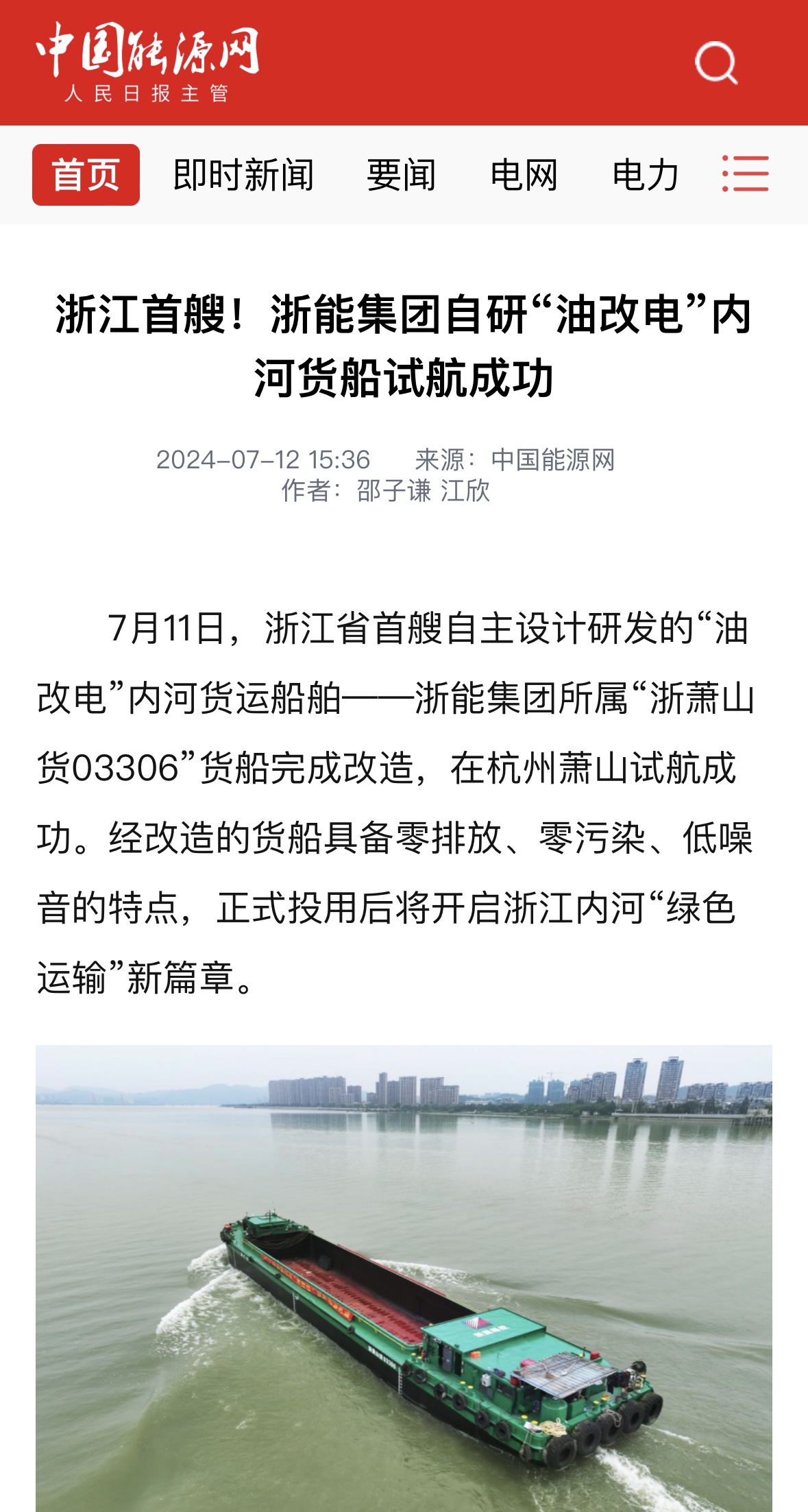 7月12日,中國(guó)能源網(wǎng)報(bào)道《浙能集團(tuán)自研“油改電”內(nèi)河貨船試航成功》。 中國(guó)能源網(wǎng) 圖