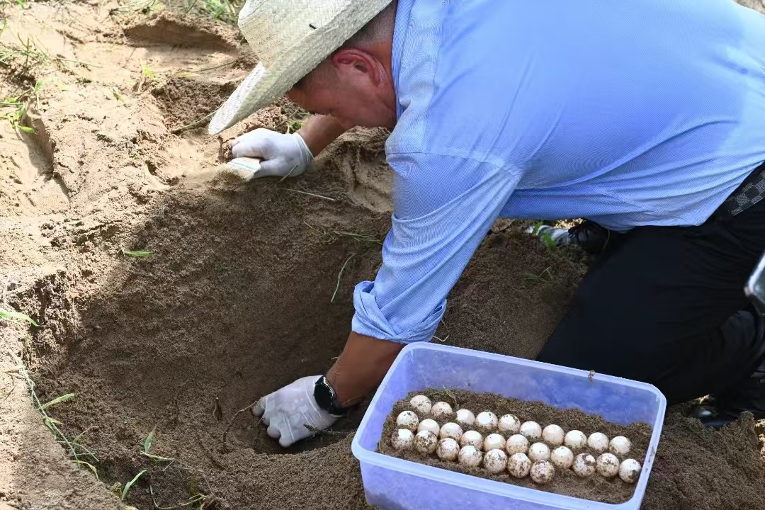 隨著表面黃褐色的沙土被撥開(kāi),在大約深30公分的位置,一枚枚雪白的黿卵也現(xiàn)出真容,葉承義用刷子輕輕掃開(kāi)黿卵旁邊的泥土,小心翼翼將它們拿進(jìn)塑料盒,帶回站內(nèi)的控溫車(chē)間內(nèi)進(jìn)行測(cè)量、登記,以便孵化。
