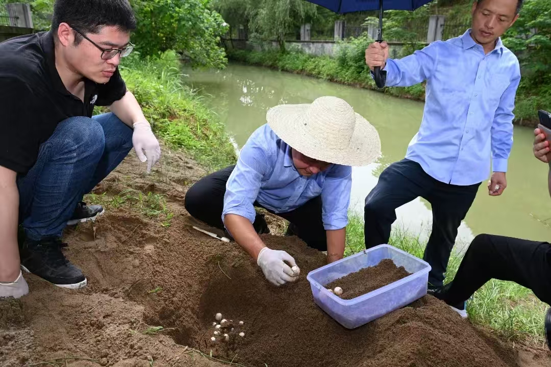 在灘坑水電站水生生物增殖放流站親黿培育池旁的土坡上,增殖放流站站長(zhǎng)葉承義正在珠江水產(chǎn)研究所所長(zhǎng)朱新平的遠(yuǎn)程指導(dǎo)下,對(duì)黿卵進(jìn)行操作?!拔覀儾荒軄y挖一氣,濕潤(rùn)的沙土中往往埋藏著黿卵,挖的時(shí)候動(dòng)作必須要輕柔?!比~承義用手將產(chǎn)卵周邊的沙土一點(diǎn)點(diǎn)撥開(kāi)。