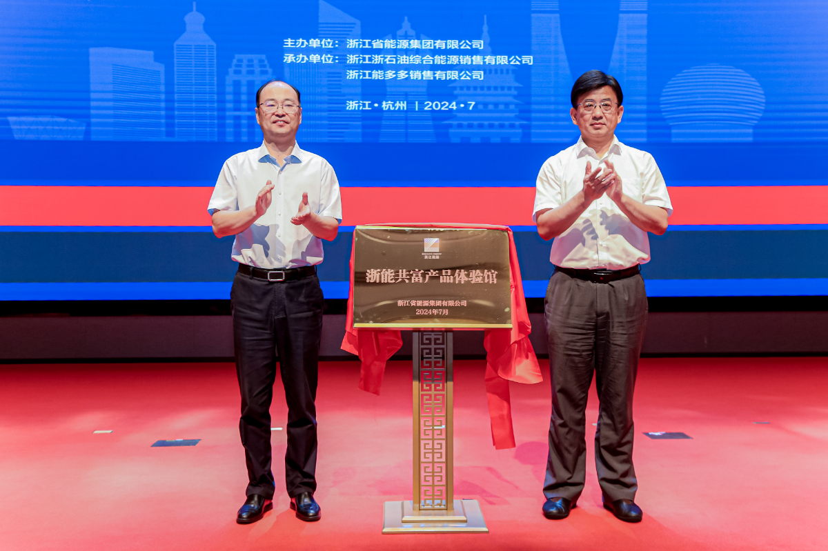 集團(tuán)黨委副書記王其達(dá)與集團(tuán)黨委委員、工會(huì)主席胡斌為“浙能集團(tuán)共富體驗(yàn)館”揭牌。 陳統(tǒng) 提供