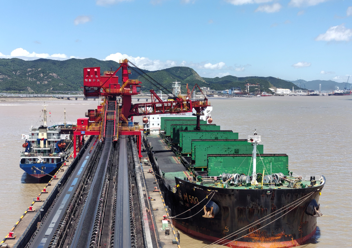 浙能集團采購的進口煤正在舟山六橫港搶裝,為省內(nèi)電廠送去夏日“口糧”。 劉洋 攝