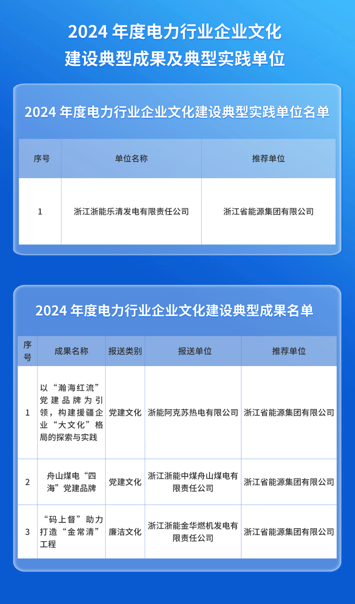 本網(wǎng)訊 近日,中國電力企業(yè)聯(lián)合會公布2024年度電力行業(yè)企業(yè)文化建設(shè)典型成果及典型實踐單位獲獎名單,浙能集團(tuán)共計3項成果、1家單位成功入選。其中,浙能樂清發(fā)電公司榮獲企業(yè)文化建設(shè)典型實踐單位,阿克蘇熱電《以“瀚海紅流”黨建品牌為引領(lǐng)、構(gòu)建援疆企業(yè)“大文化”格局的探索與實踐》、舟山煤電《“四海”黨建品牌》和金華燃機《“碼上督”助力打造“金常清”工程》3項案例榮獲企業(yè)文化建設(shè)典型成果獎,充分發(fā)揮了企業(yè)文化建設(shè)示范作用。