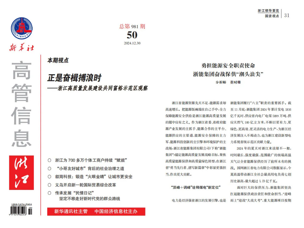 新華社《社高管信息》報(bào)道《勇?lián)茉窗踩氊?zé)使命 浙能集團(tuán)奮戰(zhàn)保供“潮頭浪尖”》 新華社《社高管信息》 圖
