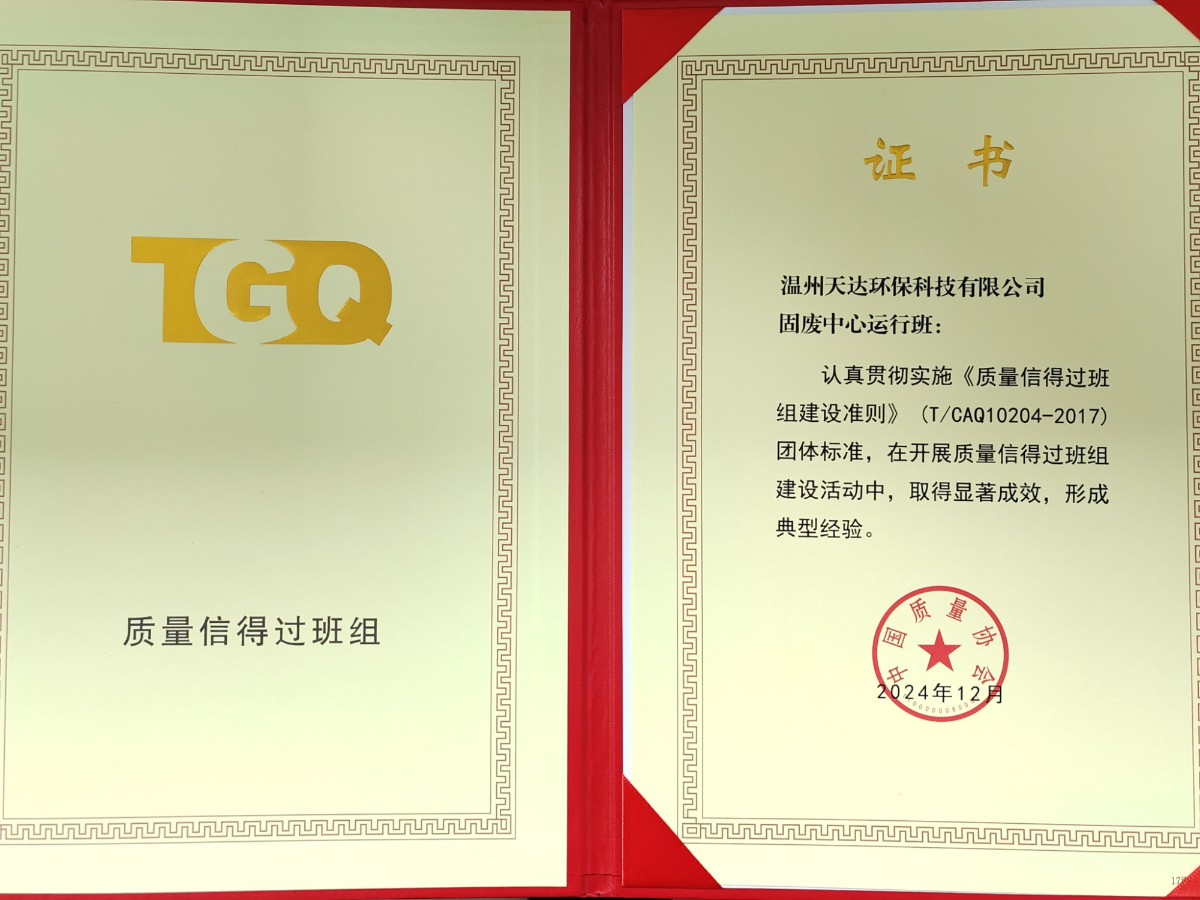 溫州天達(dá)環(huán)保科技有限公司固廢中心運(yùn)行班組“全國(guó)質(zhì)量信得過(guò)班組”榮譽(yù)證書。 傅催然 攝
