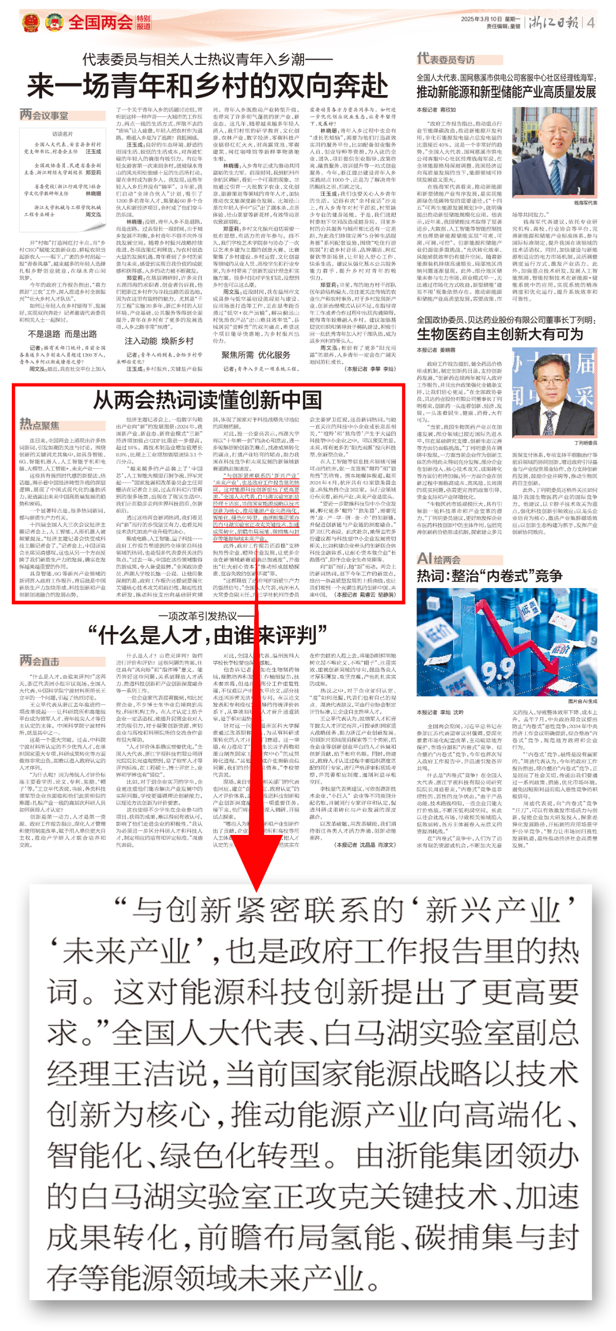 《浙江日報(bào)》全國兩會(huì)特別報(bào)道《從兩會(huì)熱詞讀懂創(chuàng)新中國》再次聚焦全國人大代表、浙能集團(tuán)王潔同志。 浙江日報(bào) 圖