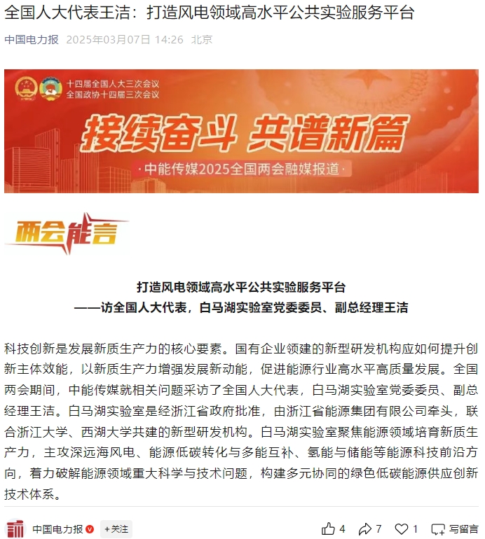《中國電力報(bào)》微信公眾號報(bào)道《全國人大代表王潔:打造風(fēng)電領(lǐng)域高水平公共實(shí)驗(yàn)服務(wù)平臺(tái)》。 中國電力報(bào)微信公眾號 圖