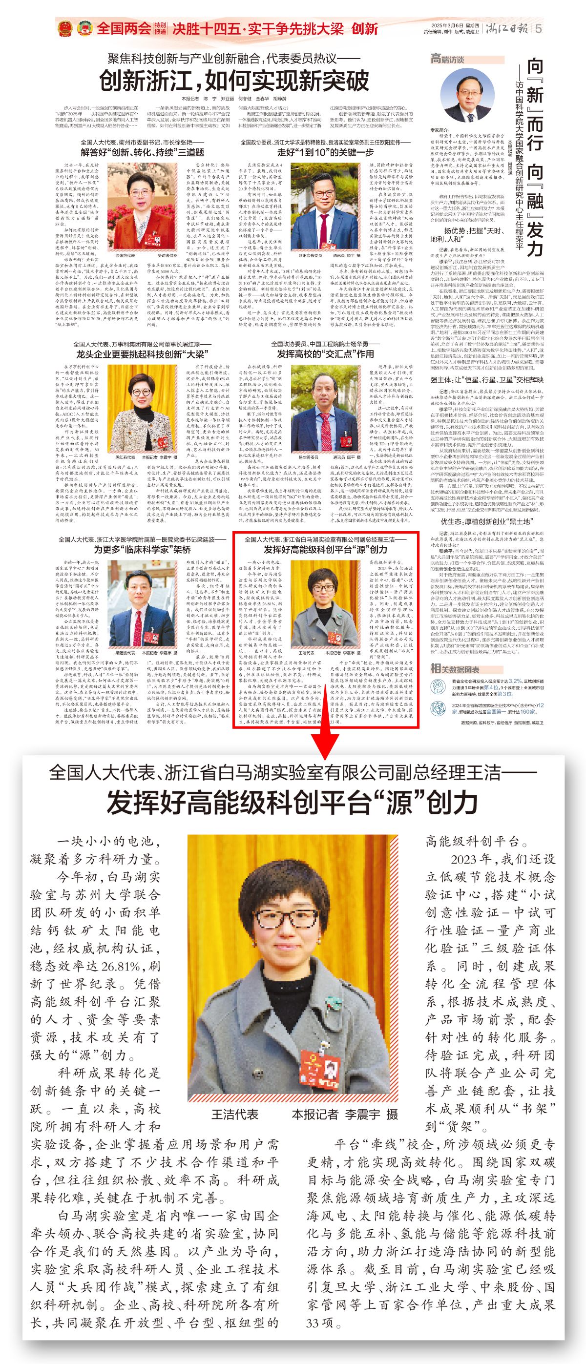 《浙江日報(bào)》全國兩會(huì)特別報(bào)道《全國人大代表、浙江省白馬湖實(shí)驗(yàn)室有限公司副總經(jīng)理王潔——發(fā)揮好高能級科創(chuàng)平臺(tái)“源”創(chuàng)力》。 浙江日報(bào) 圖
