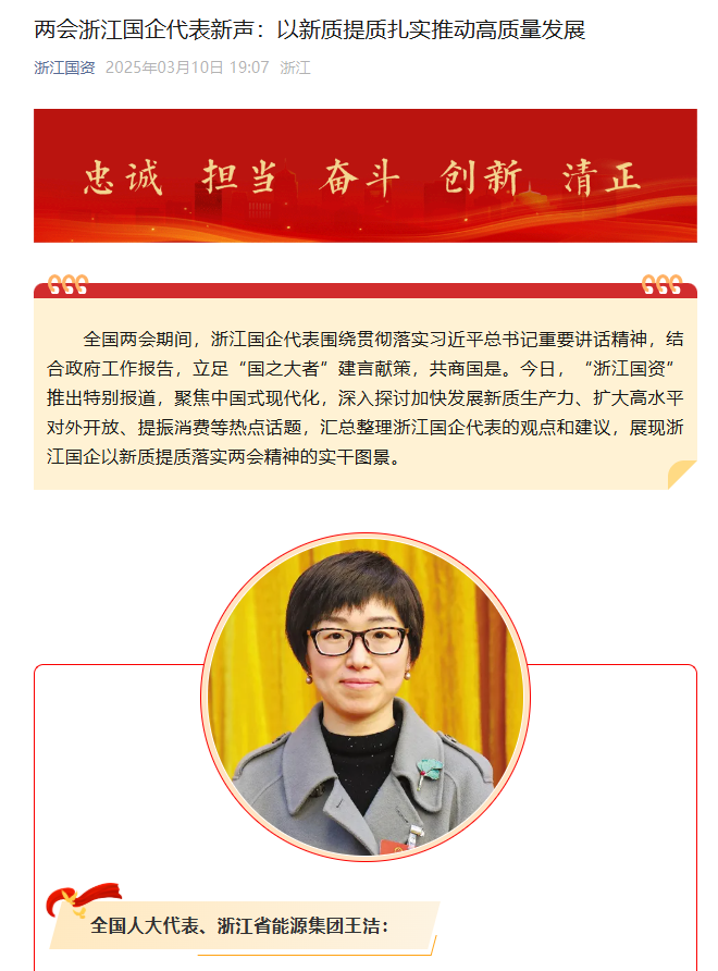 “浙江國資”微信公眾號報(bào)道《兩會(huì)浙江國企代表新聲:以新質(zhì)提質(zhì)扎實(shí)推動(dòng)高質(zhì)量發(fā)展》。 浙江國資 圖