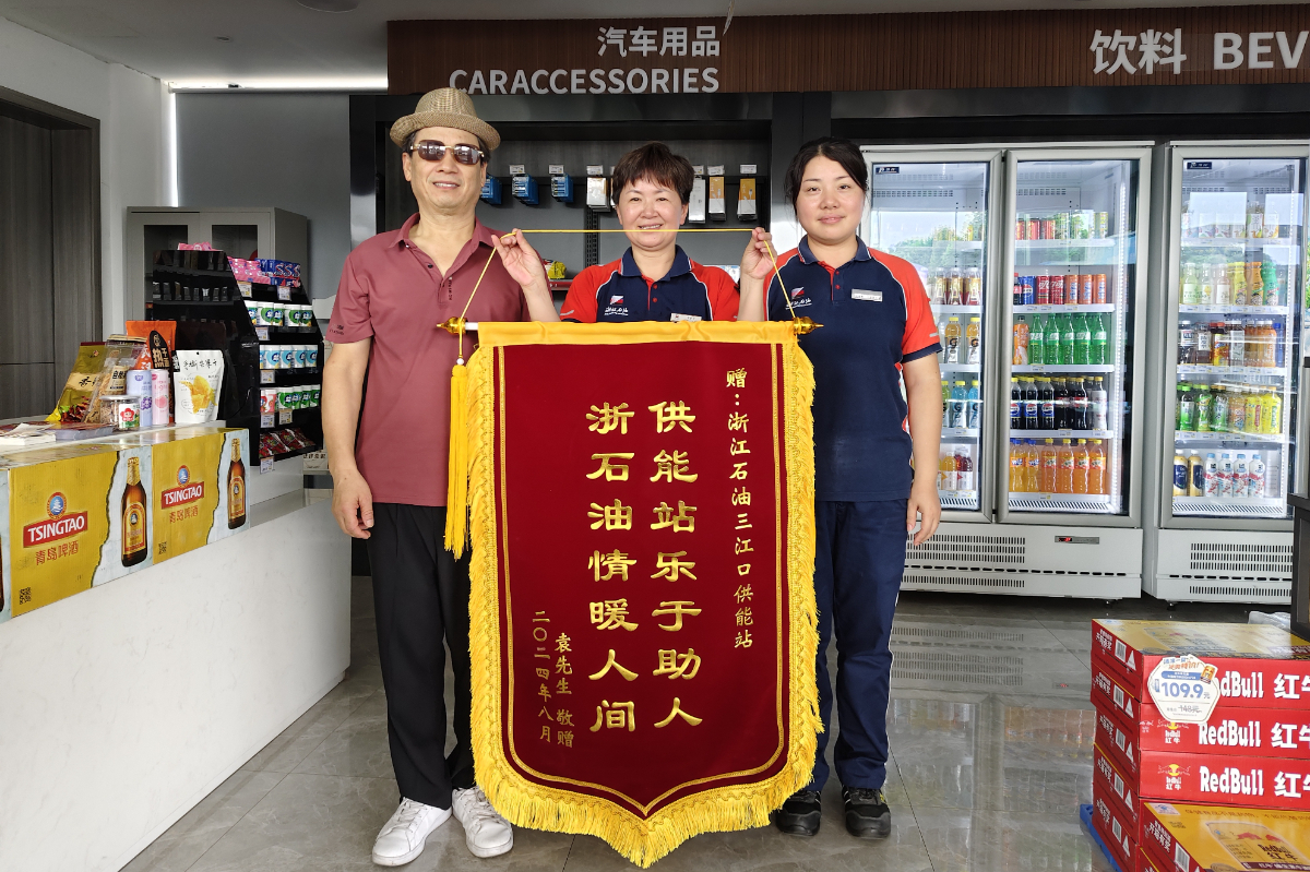 嵊州市民向浙石油紹興嵊州三江口站贈(zèng)送錦旗,感謝危急時(shí)刻的生命救助。 王浙攀 攝
