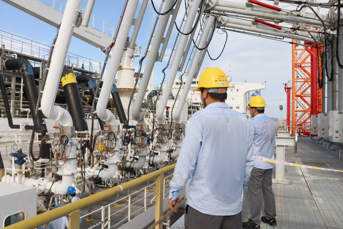 烈日下,溫州LNG公司操作監(jiān)督組成員為接船作業(yè)提供岸上協(xié)作與監(jiān)護支持。 謝晨瀅 攝