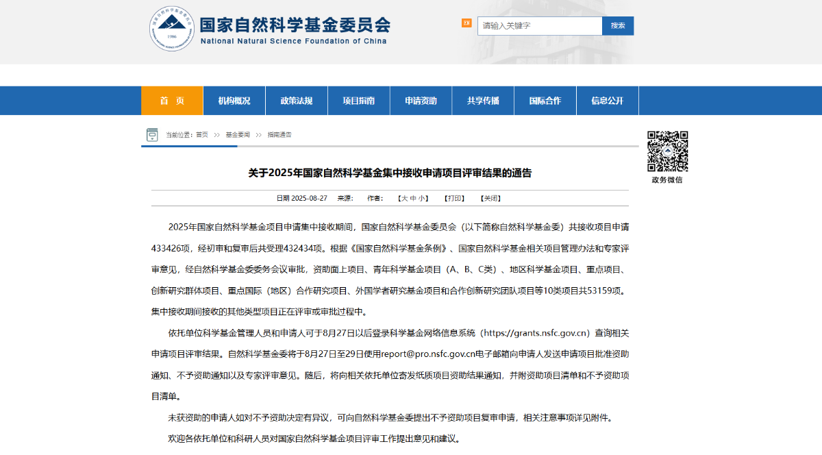 《關(guān)于2025年國家自然科學(xué)基金集中接收申請項(xiàng)目評審結(jié)果的通告》 國家自然科學(xué)基金委員會 圖