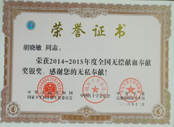 近日,溫州發(fā)電公司員工胡曉敏獲全國無償獻血奉獻銀獎,這是他第2次獲得“全國無償獻血奉獻銀獎”殊榮,也是對他多年來長期堅持無償獻血,關心公益事業(yè)的肯定與褒獎。