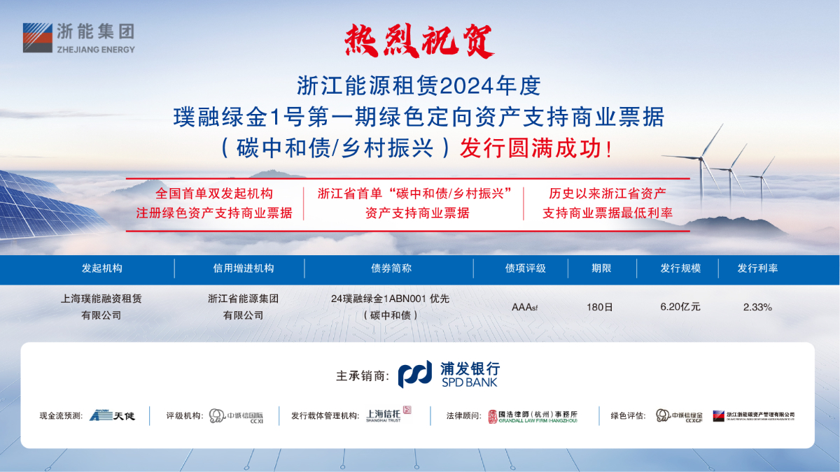 本網訊 1月31日,浙能集團旗下上海璞能融資租賃有限公司成功發(fā)行浙江省內首單“碳中和債/鄉(xiāng)村振興”資產支持商業(yè)票據(ABCP)。本次發(fā)行規(guī)模6.21億元,其中次級0.01億由發(fā)行人自持,優(yōu)先級獲得最高債項評級AAAsf,票面利率2.33%,創(chuàng)浙江省資產支持票據發(fā)行利率歷史新低、全國市場資產支持票據利率今年新低。