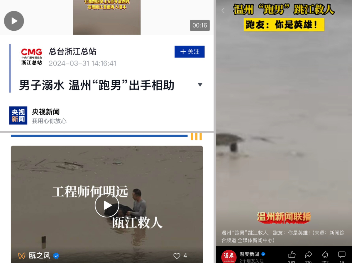 3月30日,浙石油綜合能源銷售有限公司浙南黨支部黨員何明遠在晨跑途中遇人落水,危急關(guān)頭他挺身而出,奮不顧身跳入甌江成功施救,用勇敢善舉踐行浙江國資國企新風(fēng)尚,事跡獲央視新聞和當(dāng)?shù)匦侣劽襟w轉(zhuǎn)載報道。
