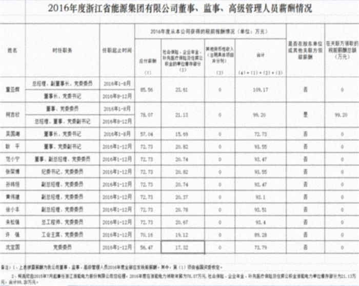 2016年度浙江省能源集團有限公司董事、監(jiān)事、高級管理人員薪酬情況
