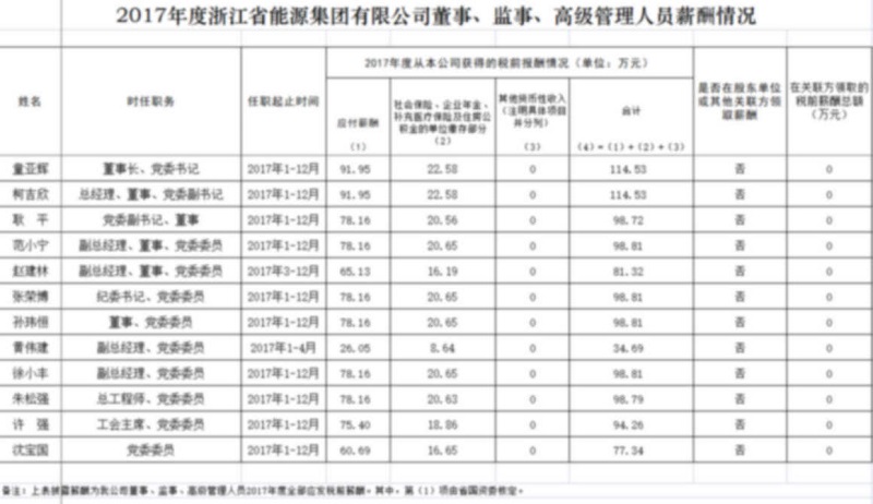 2017年度浙江省能源集團(tuán)有限公司董事、監(jiān)事、高級管理人員薪酬情況